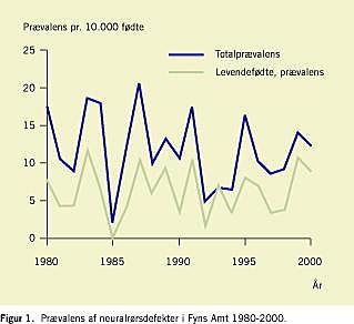 Den officielle anbefaling i Danmark er i skrivende stund uændret fra anbefalingerne i 1997, dvs. en anbefaling af perikonceptionelt tilskud af folinsyre, men ikke obligatorisk folinsyreberigelse af mel. Der er årlig omkring 76 tilfælde af NTD i Danmark, omregnet fra data fra Fyns Amt 1980-1999 (levendefødte, intrauterint døde og provokerede aborter efter prænatal diagnostik af misdannelser) [3] (Figur 1 ). Da det har vist sig, at under 20% af de danske kvinder følger de officielle anbefalinger om perikonceptionelt tilskud af folinsyre [3], må resultaterne og overvejelserne i EUROCAT-rapporten være relevante i Danmark.