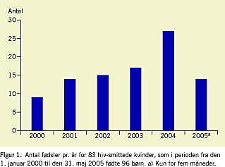 Der blev i Danmark i løbet af 2000-2005 født i alt 96 børn af 83 kvinder, hvis hiv-infektion var erkendt. Dette er en fordobling i forhold til den foregående femårsperiode, hvor 48 hiv-smittede kvinder tilsammen fødte 50 børn [6]. Den vertikale transmission er samtidig hermed blevet reduceret, idet der ikke forekom smitte i perioden 2000-2005, mens fem børn (10%) blev smittet i løbet af 1994-2000 [6]. Alle fem børn blev født vaginalt, og ingen af de gravide kvinder havde fået den fulde, rekommanderede antiretrovirale kombinationsbehandling.