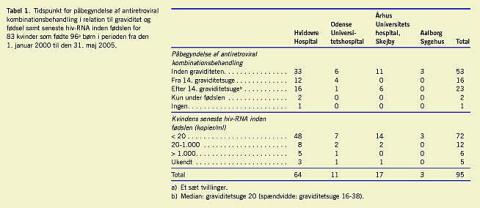 Af Tabel 1 ses, at ART var påbegyndt på konceptionstidspunktet i 53 (56%) graviditeter, mens behandlingen først blev påbegyndt under graviditeten i 39 (41%) tilfælde, heraf 16 i graviditetsuge 14. To blev kun behandlet under fødslen, og en fik ingen behandling. Ved 90 (95%) fødsler blev der givet intravenøs zidovudin til kvinden intrapartum. I to tilfælde blev det ikke givet, og i tre tilfælde var det ikke oplyst. I det ene af de to tilfælde, hvor der ikke blev givet zidovudin, blev kvinden først konstateret hiv-smittet ved fødslen, og i det andet tilfælde fødte kvinden pludseligt og før tid i eget hjem.