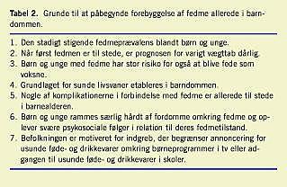 Børn og unge, der er blevet overvægtige, bliver socialt stigmatiseret og har øget risiko for tidligt at få metaboliske sygdomme. Desuden er behandling af overvægt og fedme ikke særlig succesfuld. Dette er baggrunden for, at tidlig opsporing af risikobørn og forebyggelse er så vigtig, hvis fedmekurven skal knækkes. Forebyggelse af børnefedme er ikke nogen let opgave, og der er endnu ikke udviklet strategier på videnskabelig basis, der angiver en entydig måde at forebygge på. Alle, også forfatterne, er enige om, at der bør handles nu med promovering af sund livsstil rettet mod alle børn og unge, også de yngste, og deres forældre. Der er også behov for bedre behandlingstilbud til dem, der er overvægtige. Børn kan tabe sig på julemærkehjem, men vi mangler behandlingstilbud med dokumenteret langtidseffekt til børn, der bliver i familien. Desuden mangler der i hospitalsvæsenet børnecentre med specialviden om behandling og komplikationer.