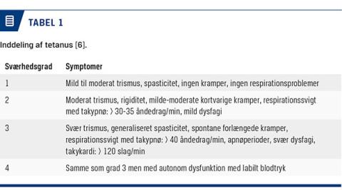 Tetanus kan inddeles i fire grupper alt efter sværhedsgraden (Tabel 1) [6]. Den primære behandling rettes mod at undertrykke krampetendensen medikamentelt og undgå eksterne stimuli. Der skal straks påbegyndes i.v.-behandling med penicillin 2 MIE × 3 dagl., og ved penicillinallergi gives metronidazol 1 g × 2 dagl. i.v., i praksis vil begge præparater ofte blive givet. Desuden gives humant tetanusimmunglobulin 3.000-6.000 IE intramuskulært. En del af immunglobulinerne skal gives omkring indgangsporten, hvis denne kendes [3]. Tetanusimmunglobulin bør forefindes på alle skadestuer/akutafdelinger og udleveres gratis fra Statens Serum Institut (SSI).