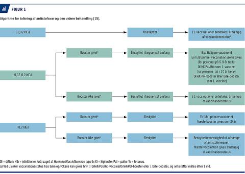 I dag er den eneste valide metode til måling af patienters antistofniveau enzymimmunanalyse, som udføres på SSI og er en dyr og tidskrævende undersøgelse, der ikke bliver lavet rutinemæssigt. I Danmark anses antistofniveauer under < 0,02 IE/ml for at være ikkebeskyttende, antistoffer i intervallet 0,02-0,2 IE/ml anses for at være begrænset beskyttende, og niveauer > 0,2 IE/ml regnes for at være sikkert beskyttende (Figur 1). Den egentlige grænse for immunitet er formentlig noget lavere [15]. WHO har fastlagt, at man bør anvende en nedre grænse for sikker beskyttelse i intervallet 0,1-0,2 IE/ml ved anvendelse af kommercielle kit på laboratorier [16]. Den efterfølgende validering af anvendte metoder i Danmark har betydet, at vi er landet på en grænse på 0,2 IE/ml for beskyttende antistoffer.