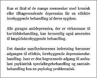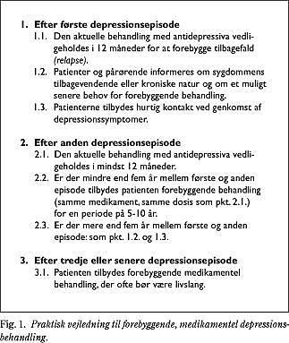Livstidsrisikoen for depressioner er i den danske befolkning ca. 15%, og mindst halvdelen af de syge får flere depressionsepisoder i løbet af tilværelsen, så mange at forebyggende medikamentel behandling er indiceret. Imidlertid er det kun et fåtal, der faktisk opnår at komme i en sådan behandling. Konsekvensen heraf er et stort antal selvmord, genindlæggelser og førtidspensioneringer, hvortil kommer tab af livskvalitet og samfundsproduktion (1). Antagelsen om, at kun et fåtal modtager en virksom forebyggende behandling, er ikke i første række baseret på danske undersøgelser, idet sådanne savnes. Antagelsen er baseret på undersøgelser af befolkningsgrupper, der kan sammenlignes med tilsvarende danske, f.eks. fra USA og Holland (2, 3). Skøn baseret på undersøgelser fra disse lande viser, at mindre end 10% af mennesker med recidiverende, behandlingskrævende depressioner modtager en kvalificeret forebyggende behandling.