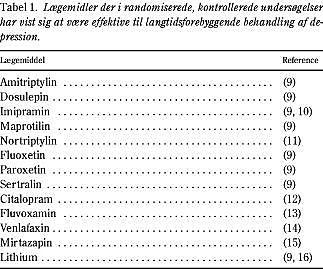 Den foreliggende videnskabelige evidens for den forebyggende virkning af langtidsbehandling af depressioner med psykofarmaka er begrænset. De psykofarmaka, der kommer på tale, er henholdsvis gamle og nye antidepressiva samt lithium. Resultaterne af de 15 kontrollerede undersøgelser, der er publiceret frem til og med 1993, af mindst et års varighed og med en placeboarm, er resumeret i en oversigt af Prien & Kocsis (9). De fandt, at otte af de lægemidler, der er anført i Tabel 1 , alle havde vist forebyggende effekt i mindst en af undersøgelserne. Imidlertid var det kun otte af de 15 undersøgelser, der havde en opfølgningstid på to år eller derover. I den bedste af disse undersøgelser blev der fundet recidivfrihed for 80% af patienterne med imipramin og kun for 20% med placebo med tre års opfølgningstid (10). I de senere år er der blevet publiceret resultater af undersøgelser, der viser, at også nortriptylin (11) og visse selektive serotoningenoptagshæmmere (SSRI), der ikke fremgår af Prien & Kocsis' oversigt, har effekt ved forebyggende behandling. Det gælder både for citalopram (12) og for fluvoxamin (13), der har vist forebyggende virkning i nyere, kontrollerede undersøgelser. Det samme gælder for nogle andre nyere såkaldte dual action- antidepressiva som venlafaxin (14) og mirtazapin (15). For lithiums vedkommende er der siden Prien & Kocsis' opgørelse (9) fremlagt yderligere dokumentation for en forebyggende virkning ved unipolære, tilbagevendende depressioner (16).