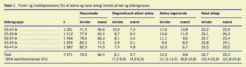 I alt 498 personer havde diagnosticeret aktuel astma, hvilket giver en prævalens på 7,0% (95% konfidensinterval (CI): 6,4-7,6), uden signifikant forskel amterne imellem. I Tabel 1 vises prævalensen af diagnosticeret aktuel astma samt livstidsprævalens af astma og nasal allergi fordelt på aldersgrupper og køn. Prævalensen af diagnosticeret aktuel astma var væsentlig højere blandt kvinder end blandt mænd (p < 0,001). Prævalensen var højest i den yngste aldersgruppe og faldende med alderen bortset fra hos kvinder i den ældste aldersgruppe. Livstidsprævalens af astma viste samme mønster med en samlet prævalens på 11,3% (95% CI: 10,6-12,0). Blandt personer med selvrapporteret astma nogensinde var diagnosen blevet bekræftet af en læge i 95% af tilfældene. I alt 1.688 personer angav allergi i næsen, hvilket giver en samlet prævalens på 23,5% (95% CI: 22,5-24,5), men i modsætning til astma uden køns- eller aldersforskel.