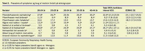 Diskussion: Sammenligning af resultaterne med ECRHS fra 1994 viste en markant stigning i prævalensen af diagnosticeret aktuel astma i den mellemliggende periode, mens prævalensen af astmalignende symptomer var lavere eller uændret. Det konkluderes, at prævalensen af diagnosticeret astma rapporteret af yngre voksne fortsat stiger, hvilket kan skyldes en kohorteeffekt med øget incidens af astma især i barndom og ungdom eller en ændret astmadiagnostik.