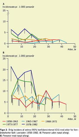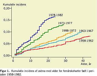 Sammenligning af resultaterne med de danske prævalenstal fra 1994 i ECRHS [9] viser lavere eller uændret prævalens af astmalignende symptomer, mens rapportering af astmaanfald det seneste år og aktuel brug af medicin mod astma er steget markant i den mellemliggende periode. Sammenlagt er der er tale om en statistisk signifikant stigning i prævalensen af diagnosticeret aktuel astma fra 4% til 7%. Den progressive stigning i kumulativ incidens af astma er konsistent med resultaterne for kohorterne født i perioden 1946-1971 i ECRHS [5] og viser, at stigningen i incidens af astma fortsætter i de efterfølgende kohorter født i 1973-1977 og 1978-1982.