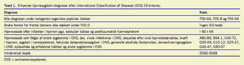 Formålet med undersøgelsen var at: 1) fastlægge hvor mange patienter, der på et år (2002) i en gerontopsykiatrisk søjle havde fået stillet en diagnose, der pegede på en EHS, herunder demens, og i et vist omfang hvilken type EHS, det drejede sig om. EHS er her defineret efter International Classification of Diseases (ICD)-10-kriterier [13] og vises i Tabel 1 (tilsvarende diagnoser inden for ICD-8 og tidligere diagnosesystem anses også for at være EHS-diagnoser, men specificeres ikke nærmere her), og 2) undersøge på hvilken baggrund (dvs. hvilke typer undersøgelser) diagnosen blev stillet.
