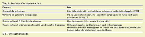 I den endelige undersøgelse var alle patienter, der havde været indlagt i gerontopsykiatrisk søjle (lukkede og åbne døgnafdelinger og på daghospitalet) i 2002, fundet gennem »det grønne system« (elektronisk registreringssystem). Eksklusionskriterierne var: 1) at patienten ikke var fyldt 65 år ved indlæggelsen, og 2) at patienten stadig var indlagt den 1. marts 2003 (måneden inden journalgennemgangen blev påbegyndt). Journalerne blev tilfældigt delt mellem undersøgerne. I alle tilfælde, hvor der var mistanke om EHS, blev journalerne gennemgået af begge undersøgere. De registrerede data er beskrevet i Tabel 2 .