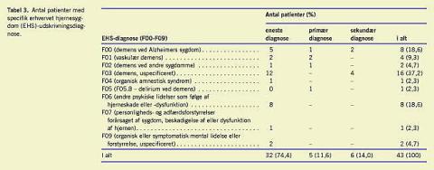 Metode og materialer: Journaler for alle indlagte patienter på denne gerontopsykiatriske afdeling (lukket afdeling, åben afdeling og daghospital) i 2002 blev gennemgået for at undersøge: 1) EHS-udskrivelsesdiagnose, 2) tidligere EHS-diagnose og 3) baggrunden for disse diagnoser.