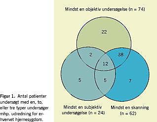Der kan desuden argumenteres for, at det er vigtigt at vide, hvor stor en procentdel af patienterne på et gerontopsykiatrisk afsnit, der har en anden form for erhvervet hjernesygdom (EHS) end demens. Man har i adskillige undersøgelser fundet, at psykiske lidelser, især depression og angst, er hyppigere efter specifikke centralnervesystem (CNS)-sygdomme/ tilfælde f.eks. hovedtraumer [4, 5] og apopleksi [6, 7]). Den kliniske relevans af leukoaraiosis diskuteres stadig, og der er i nogen grad fundet bevis for en relation mellem dette og sent debuterende depression [8]. Desuden er sandsynligheden for indlæggelse på en psykiatrisk afdeling højere for patienter med en række CNS-lidelser (inklusive demens) end for patienter i kontrolgrupper [9]. EHS, herunder demens, kunne for nogle patienters vedkommende således være den primære årsag (eller en væsentlig sekundær årsag) til psykiske lidelser eller adfærdsmæssige forstyrrelse og dermed årsag til indlæggelse på en psykiatrisk afdeling. Især på grund af den med alderen stigende incidens af demens [10], stroke [11] og leukoriaosis [12] må diagnosticering af EHS såvel som afkræftelse af mistanke om EHS anses for at være væsentlig for den optimale behandling i gerontopsykiatri [1].