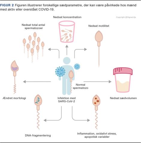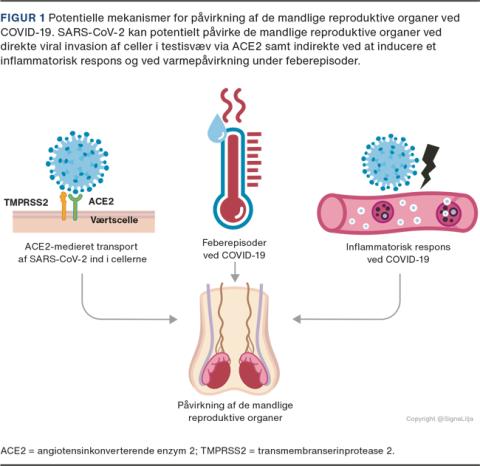 SARS-CoV-2 kan påvirke de mandlige reproduktive organer ved direkte ACE2-medieret, viral invasion i Leydigceller, Sertoliceller og spermatogonier. TMPRSS2 er dog ikke udtrykt i lige så høj grad i celler i testis som ACE2, og sandsynligheden for direkte transmission af SARS-CoV-2 ved ACE2-medieret transport til sædvæsken må vurderes som værende lav [10]. SARS-CoV-2 kan imidlertid indirekte påvirke spermatogenesen ved at inducere et inflammatorisk respons og ved varmepåvirkning under feberepisoder [5, 6, 10].