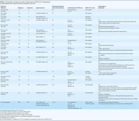 Man har i 17 publicerede studier med i alt 457 deltagere undersøgt forekomsten af SARS-CoV-2 i sæd (Tabel 1). I tre af disse studier har man påvist SARS-CoV-2-RNA i sæden hos sammenlagt otte deltagere [11-13]. I pandemiens tidlige fase blev der i et studie fra Kina påvist SARS-CoV-2 i sæden hos seks ud af 38 deltagere [11]. Fire af de seks kinesiske mænd var akut syge, og to havde overstået infektionen. I to studier har man sidenhen påvist i alt to tilfælde af SARS-CoV-2 i sæd [12, 13], hhv. hos en mand med aktiv infektion og hos en mand, der havde været indlagt på intensivafdeling, men som ved tidspunktet for inklusion i studiet var kommet sig over sygdommen. I sidstnævnte studie undersøgte man desuden prostatavæske og urin hos deltagerne og fandt SARS-CoV-2-RNA i urinen hos to deltagere [12]. I de øvrige studier, hvor man undersøgte både asymptomatiske SARS-CoV-2-positive mænd, patienter, som havde været indlagt på intensivafdeling, og mænd med aktiv og overstået SARS-CoV-2-infektion, fandt man ingen tilfælde af smitte ej heller ved followup op til tre måneder efter overstået infektion [4, 14-25].