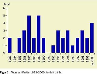 Børnevaccinationsprogrammet har haft en meget høj tilslutning i de sidste 20 år, idet 97-99% af alle børn modtager tre primærvaccinationer med tetanusholdig vaccine (DiTePol eller DiTeKiPol) [1]. I 1996 blev der indført en DiTe-booster i børnevaccinationsprogrammet til femårige børn for at sikre en generel længerevarende immunitet, formentlig 20 år [2]. Varighed af immunitet efter revaccination med DiTe-booster blev i 1997 ændret til at være mindst ti år i alle tilfælde [3]. Baggrunden herfor var en reduceret styrke af difterikomponenten i DiTe-booster ; styrken af tetanuskomponenten var uændret fra tidligere. Herudover var styrken af både tetanus- og difterikomponenten i DiTeKiPol (anvendt fra 1. januar 1997) reduceret i forhold til DiTePol. Vaccination samt evt. tetanusimmunglobulin anbefales til voksne, der har sårskade og er ubeskyttede mod tetanus, enten fordi de er uvaccinerede, ufuldstændigt vaccinerede, eller hvor tidspunktet for revaccination er overskredet. Der er således gode muligheder for at forebygge tetanus i Danmark. Epidemiologien af tetanus i Danmark er tidligere blevet beskrevet for perioden 1920-1982 [4]. Det gennemsnitlige årlige antal tilfælde af tetanus var for 10-års-perioderne 1963-1972 og 1973-1982 hhv. 14 (8-23) og syv tilfælde (2-15).