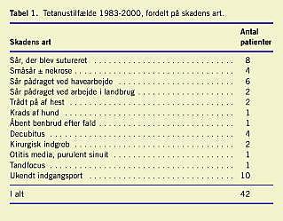 Diskussion: Tetanusforekomsten er faldet markant efter indførelsen af børnevaccinationsprogrammet. Tetanus var klart underrapporteret i MIS, 11 tilfælde var ikke anmeldt, og i LPR manglede fire tilfælde. Patienter, der behandles i tilslutning til en sårskade, skal have foretaget en risikovurdering, og ved ukendt vaccinationsstatus behandles med TIG og vaccination. Specielt skal opmærksomheden rettes mod personer, der er født før 1950, og for at sikre en bedre immunisering af denne gruppe kunne det overvejes at vurdere vaccinationsstatus systematisk og evt. tilbyde tetanusvaccination i forbindelse med lægebesøg.