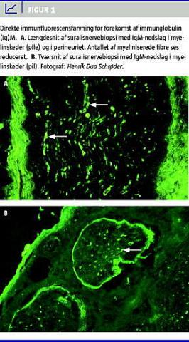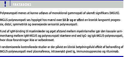 Summary Polyneuropathy associated with monoclonal gammopathy of undetermined significance Ugeskr Læger 2012;174(43):2630-2634 The prevalence of polyneuropathy in patients with monoclonal gammopathy of undetermined significance (MGUS) has been reported to be 10-50%. The majority of patients have a chronic, slowly progressive, distal, symmetric and predominantly sensory polyneuropathy. A caused relationship between polyneuropathy and immunoglobulin (Ig)M MGUS is better established than the relationship between polyneuropathy and IgG/IgA MGUS because of the observed binding of IgM to myelin sheaths and widening of myelin lamellae. In randomized controlled trials plasma exchange, immunosuppressiva, rituximab and intravenous Ig have been found to have a clinical meaningful effect.