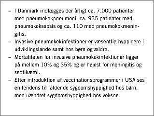 Ved invasive pneumokokinfektioner forstås pneumoni, meningitis og sepsis forårsaget af Streptococcus pneumoniae . Årlig indlægges ca. 7.000 patienter med pneumokokpneumoni, ca. 935 med pneumokoksepsis og ca. 110 med pneumokokmeningitis. Dette svarer til tallene for andre europæiske lande, Australien og USA. Hyppigheden af invasiv pneumokokinfektion er højest hos børn og ældre og væsentligt højere i udviklingslande end i industrialiserede lande. Årsagerne hertil er ukendte, men faktorer som rygning, boligforhold, ernæring og genetiske faktorer er fundet at have sammenfald med pneumokokinfektioner. Mortaliteten for invasive pneumokokinfektioner ligger på mellem 10% og 35% og er højest for meningitis og septikæmi.