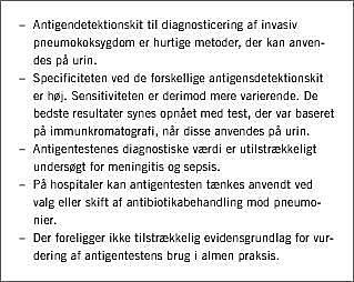 Der findes ingen metoder, som muliggør en hurtig og korrekt diagnostik af pneumokokinfektioner. De nyere urinantigentest, der er baseret på immunkromatografi, har en høj specificitet for pneumokokpneumoni hos voksne, og sensitiviteten varierer i forskellige undersøgelser fra 52% til 100%. Antigentestenes diagnostiske værdi er utilstrækkeligt undersøgt for meningitis og sepsis. Som indikationsområder for urinantigentesten kan følgende kliniske situationer overvejes: 1) pneumoni, hvor antibiotisk behandling rettet mod atypiske agens overvejes, og 2) pneumoni med manglende forventet behandlingsrespons på penicillinbehandling. Værdien af antigentest i den primære sundhedssektor er uafklaret.