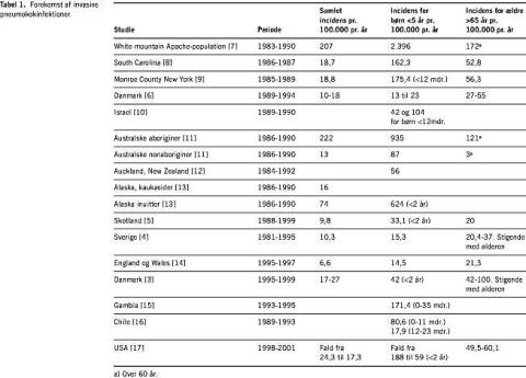 I danske undersøgelser har man fundet en incidens for pneumokoksepsis på 17 pr. 100.000 indbyggere pr. år [3]. I tilsvarende undersøgelser fra Sverige og Skotland rapporteres der om en incidens på henholdsvis 9,6 og 9,0 pr. 100.000 indbyggere pr. år [4, 5]. Incidensen for pneumokoksepsis er størst hos børn under to år og hos ældre over 65 år. I Danmark kan den aldersspecifikke incidens hos børn under to år estimeres til mellem 13 og 42 pr. 100.000 indbyggere pr. år [3, 6]. Tabel 1 viser en opsummering af studier der har undersøgt incidensen af invasive pneumokokinfektioner.
