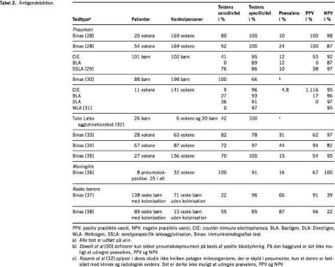 Latexagglutination til detektion af kapselantigener har vist sensitiviteter fra 0% for Bactigentest på urin [29] og op til 93% på Wellcogen Kit i ekspektorat [26] blandt patienter med pneumokokpneumoni [39]. Specificiteten ligger derimod højt - i alle studier omkring de 90%. Dette giver en positiv prædiktiv værdi (PPV) fra 0% [29, 31] til 33%. Mens negativ prædiktiv værdi (NPV) ligger i området 76-97%.