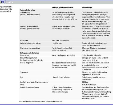 Definitiv tb-diagnostik kræver principielt altid påvisning af M. tuberculosis fra relevant materiale (Tabel 1 ), men i en del tilfælde behandler man på baggrund af typiske kliniske og radiologiske fund. Årsager til manglende verifikation kan være diagnose tidligt i sygdomsforløbet, hvor antallet af bakterier er lavt, ingen eller få undersøgte prøver eller for lang transporttid [1].