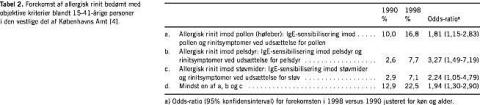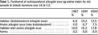 På Statens Institut for Folkesundhed gennemfører man regelmæssigt landsdækkende interviewundersøgelser af repræsentative stikprøver af den danske befolkning (sundheds- og sygelighedsundersøgelserne). Resultater fra disse undersøgelser viser signifikante stigninger i forekomsten af selvrapporteret allergisk rinit (snue) i perioden fra 1987 til 2000 (Tabel 1 ) [1]. Konsistent hermed har spørgeskemaundersøgelser i den vestlige del af Københavns Amt vist signifikante stigninger i forekomsten af symptomer på allergisk rinit fra 1989 til 1998 [2]. Ovennævnte undersøgelser inkluderede ikke objektive målinger, og man kan derfor ikke udelukke, at de rapporterede stigninger skyldes en øget erkendelse af sygdom og symptomer. Påvisning af IgE-sensibilisering er et accepteret objektivt mål for tilstedeværelsen af allergisk luftvejssygdom. De mest anvendte og accepterede metoder til påvisning af IgE-sensibilisering er priktestning i huden med allergener og måling af allergenspecifikt IgE i serum. Få undersøgelser har inkluderet disse metoder i gentagne tværsnitundersøgelser af befolkningen. På Københavns Amts ForskningsCenter for Forebyggelse og Sundhed (FCFS) har man gennemført to tværsnitsundersøgelser med objektive metoder blandt 15-41-årige personer, bosiddende i den vestlige del af Københavns Amt. Resultaterne viste en signifikant stigning i forekomsten af personer, der var IgE-sensibiliserede imod de vigtigste luftvejsallergener som f.eks. pollen, pelsdyr og støvmider. Således steg forekomsten af IgE-sensibilisering fra 27% til 34% fra 1990 til 1998 [3]. Som et led i denne undersøgelse gennemførtes en prospektiv undersøgelse, hvor en population af 15-69-årige fik målt IgE-sensibilisering to gange med otte års mellemrum i henholdsvis 1990 og 1998. Man kunne her se, at forekomsten af IgE-sensibilisering steg blandt de personer, som var født fra ca. 1960 og fremefter, mens der ikke kunne spores en stigning blandt personer født før 1960. Denne såkaldte kohorteeffekt indikerer, at personer født efter 1960 har været eksponeret for livsstils- eller miljøfaktorer, som har øget deres risiko for at få allergisk luftvejssygdom. En konsekvens af kohorteeffekten kan blive, at gennemsnitsalderen for patienter med allergisk luftvejssygdom vil stige i de kommende år, efterhånden som disse »allergiske generationer« bliver ældre.