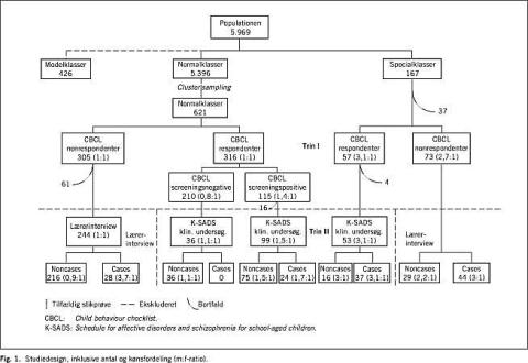 Fireogtredive repræsentative by- og landskoler blev udvalgt og anvendt i et totrins epidemiologisk design. Efter udvælgelse af stikprøve, fulgte: 1) trin I: screening med et forældrespørgeskema og 2) trin II: alle deltagende børn fra specialklasser blev, uafhængigt af screeningsstatus, sammen med alle screeningspositive og en stikprøve af screeningsnegative børn i normalklasser inviteret til yderligere undersøgelse af fem børnepsykiatriske klinikere, som var blindet i forhold til screeningsstatus.