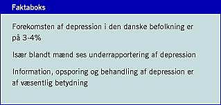 Suicidaladfærd forekommer ikke i samme omfang blandt mænd og kvinder, og især, når det gælder fuldbyrdet selvmord, er mændene langt overrepræsenteret med en hyppighed, der er tre gange så høj som for kvinder. Samtidig er det velkendt, at depression ligger til grund for over halvdelen af de fuldbyrdede selvmord [8]. At vi i den danske befolkningsund ersøgelse [4] kunne påvise, at mænd med svær depression ikke søger læge, viser, at der fortsat er et stort behov for oplysning til befolkningen om depressionssygdommens symptomer og mulighederne for behandling. Også i behandlersystemet er der fortsat brug for efteruddannelse. Det er væsentligt at kunne afdække, hvilke mænd der lider af en depression, skjult bag f.eks. alkoholmisbrug eller voldelig adfærd.
