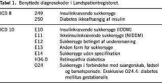 Registreret mindst en gang i LPR i perioden 1994-1999 med ICD 10-diagnosekoden E10, E11, E12, E13, E14, H36.0 eller O24 fraregnet O24.4 anført som aktionsdiagnose, bidiagnose eller grundmorbus (Tabel 1 ). Både heldøgns-, deldøgns-, ambulante og skadestuekontakter blev medtaget.