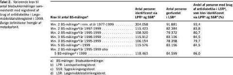 Mellem 80% og 90% af de diabetespatienter, der var i farmakologisk behandling med antidiabetika, blev - afhængig af hvilken kombination af BS-målinger der blev benyttet - opsporet via LPR og SSR (Tabel 2). Kriteriet minimum to BS- målinger pr. år i 1995-1999 eller minimum fem BS-målinger i 1999 tilstræber at inkludere dels personer, der over en forholdsvis lang periode har fået foretaget mindst to blodsukkermålinger pr. år, og som derfor formentlig har diabetes, dels personer med nyligt opdaget diabetes. Vurderet ud fra dette kriterium blev i alt 118.463 personer identificeret via SSR og LPR.