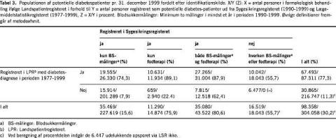 Af de personer, so m kun blev identificeret via SSR (n = 216.747), blev hovedparten alene identificeret via BS-målinger. Kun en lille andel af disse havde formentlig diabetes. Af de i alt 98.358 personer, som havde indløst mindst en recept på et antidiabetika i 1999, og som var i live pr. 31. december 1999, blev 91.881 (93,4%) genfundet i materialet, der var baseret på oplysninger fra LPR og SSR (Tabel 3).