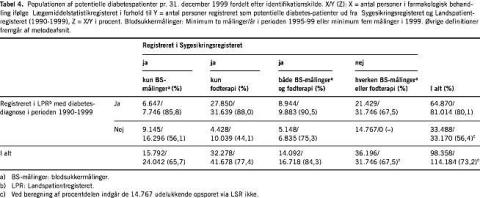I Tabel 4 vises populationen af potentielle diabetespatienter pr. 31.december 1999 fordelt efter identifikationskilde og antal og procentdel af personer i farmakologisk behandling med antidiabetika, hvor kriteriet for BS-målinger er minimum to BS-målinger pr. år i 1995-1999 eller minimum fem BS-målinger i 1999, og hvor kun LPR-kontakter fra 1990-1999 indgår. Det samlede antal diabetespatienter, der er registreret i SSR og/eller LPR, bliver derved reduceret fra 118.463 (Tabel 2) til 114.184. Af disse blev 7.151 personer alene opsporet ud fra BS-målinger. Herudover var yderligere 14.767 personer registreret i LSR med brug af antidiabetika. Det samlede antal diabetespatienter bliver således 128.951.