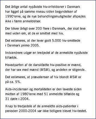 Konklusion: Skønnet lever der godt 5.000 hiv-positive personer i Danmark, heraf ca. 550 med aids. Aids-incidensen og -mortaliteten er faldet, men dette fald er ikke ledsaget af et fald i antallet af hiv-anmeldelser. Gennem de seneste år er der set en stigning i det årlige antal anmeldte MSM, en stigning, der blandt andet kan skyldes en øget forekomst af usikker sex, der delvist er betinget af opfattelsen af hiv som en behandlelig, kronisk sygdom. Der er fortsat behov for en hiv-forebyggende indsats, især rettet mod MSM.
