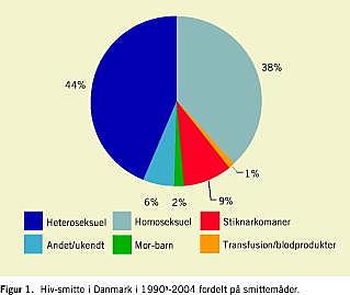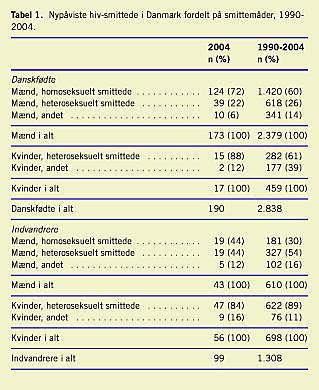 Resultater: I perioden fra den 1. august 1990 til den 31. december 2004 fik 4.254 personer påvist hiv-infektion; 3.076 (72%) mænd og 1.178 (28%) kvinder. MSM udgjorde 39% af de anmeldte, 50% blandt danskfødte og 14% blandt indvandrere. Heteroseksuelt smittede udgjorde 45%, 32% blandt danskfødte og 73% blandt indvandrere. Stofmisbrugere udgjorde 9% af de anmeldte. I 2004 var 65% af de 190 anmeldte danskfødte MSM. Af de i alt 2.530 aids-anmeldte var 1.935 døde i 2004. Det årlige antal anmeldelser faldt støt fra midten af 1990'erne. I 2004 blev der anmeldt 51 tilfælde og 31 personer døde af aids.