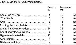 Patienter, som ikke havde demens, havde ledsagende eller tidligere sygdomme i samme omfang som patienter med demens (Tabel 1 ). Patienter, der var vurderet som demente, havde et lavere mini mental state examination (MMSE)-score (gennemsnit 20,4± 5,7) end patienter uden demens (gennemsnit 27,9± 2,9) (p<0,001).