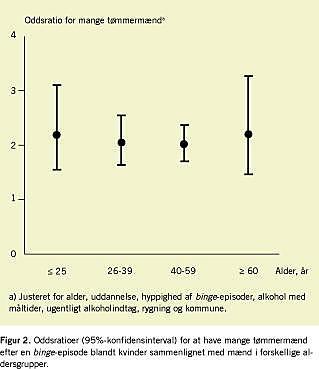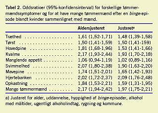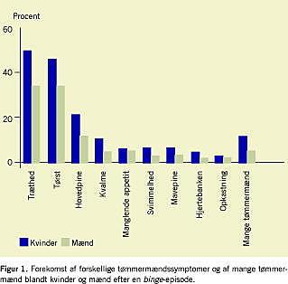 Summary The occurence of hangovers among Danish men and women Ugeskr Læger 2008;170(51):4226-4229 We have examined the occurrence of hangovers i Danish men and women. Among 36,228 particioants, the occurrence of a list of different hangover symptoms as well as of severe hangovers was higher in women than in men. For example, the odds ratio was 1.53 (95% CI: 1.41-1.66) for experiencing headache and 1.97 (95% CI: 1.75-2.21) for severe hangovers after an episode of binge-drinking in women compared with men. This finding could not be explained by weekly alcohol intake, type of alcohol ingested, frequency of binge drinking episodes or by the proportion of alcohol consumed with meals.