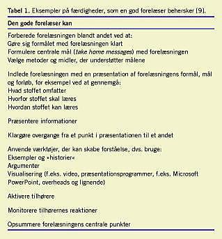 Listen over færdigheder, som en forelæser skal beherske, er lang (Tabel 1 ) [8]. Denne artikeltekst tillader ikke uddybning af alle punkterne. Men en indledning , der sætter forelæsningens indhold ind i en ramme vil sammen med en afslutning , der resumerer forelæsningens hovedbudskaber øge tilhørernes udbytte, blandt andet ved at støtte deres hukommelse. Udbyttet kan også øges ved at tilhørerne aktiveres , fordi det både skærper deres opmærksomhed og giver dem mulighed for at bearbejde det hørte stof.