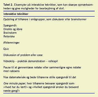 Aktivering af tilhørerne undervejs i forelæsningen har to formål: styrkelse af tilhørernes opmærksomhed og bearbejdning af stoffet. Tabel 2 viser eksempler på aktiviteter, der kan bruges i forelæsningen, så deltagerne både har det sjovt og lærer mere. Først og fremmest kan aktiviteter, som indlægges i løbet af en forelæsning sikre, at emner der er blevet præsenteret også bliver bearbejdet og dermed husket bedre. Et nordamerikansk studie, der blev udført på mere end seks tusinde fysikstuderende, viste en højsignifikant positiv sammenhæng mellem interaktivitet og indlæring [10]. Igen gælder det, at nye informationer skal kobles sammen med kendte informationer for at blive husket. Aktivering af tilhørerne i løbet af en forelæsning skaber også en afveksling, som kan skærpe tilhørernes - og forelæserens - opmærksomhed. Opmærksomheden, som er størst i begyndelsen af en forelæsning, falder støt hen over en forelæsning for hen imod slutningen kortvarigt at øges igen. Den ensformighed, som forelæserens envejskommunikation kan medføre, kan brydes ved at indlægge en aktivitet. Herved skærpes tilhørernes opmærksomhed. Den simpleste - og mest brugte - aktivitet er spørgsmål fra forelæseren til tilhørerne eller omvendt. Mange forelæsere finder tilhørernes vilje - eller evne - til at svare på spørgsmål forbavsende lav. Her gælder imidlertid, at man som forelæser ofte undervurderer de krav, som man stiller, når de ellers passive tilhørere pludselig skal producere et svar. Det kræver tid til at tænke, hvis man skal svare på andre typer spørgsmål end de, der går på paratviden. Der kan også være et socialt pres på tilhørerne for at svare korrekt. Som forelæser kan man imødekomme disse problemer ved dels at være opmærksom på, at der skal indlægges mere end et par sekunder til at gennemtænke et svar, og dels kan man kvalificere svarene ved at bede tilhørerne diskutere svaret i grupper på to eller tre.