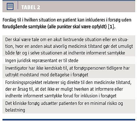(Tabel 2), og samtykke eller stedfortrædende samtykke skal indhentes ved førstkommende lejlighed. Denne mulighed for inklusion af patienter i akutte forsøg er allerede på nuværende tidspunkt gældende for ikkelægemiddelforsøg, og det synes at være umiddelbart fornuftigt at indføre samme regelsæt for lægemiddelforsøg.