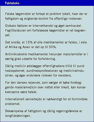 Denne statusartikel tager udgangspunkt i midler, der i særlig grad forfalskes i fattige lande, nemlig malariamidler. Mulige årsager til udbredt svindel med malaria- og lignende midler diskuteres, og det lokale og globale ansvar for at afhjælpe problemet fremhæves. Ulovlig handel og distribution af narkotika, illegale anabolske steroider, EPO og lignende omtales ikke.