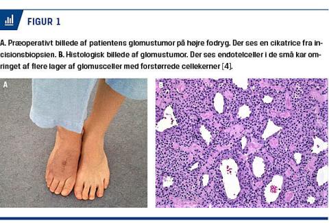 En 14-årig dreng blev henvist pga. en smertefuld og misfarvet hudtumor på fjerde metatarsofalangealled (Figur 1 A). En MR-skanning viste en 4,5 × 4,5 cm malignitetssuspekt tumor med bløddels- og knogleinvolvering omkring anden, tredje og fjerde metatars. En biopsi viste malign glomustumor, og en PET-CT viste ingen tegn på metastatisk sygdom.
