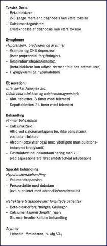 Toksiciteten er afhængig af præparatet og grundsygdommen. Som tommelfingerregel er den akut toksiske dosis 2-3 gange den maksimale terapeutiske døgndosis [2]. Efter indtagelse af en toksisk dosis vil 80% af patienterne få symptomer inden for to timer og stort set alle inden for fire timer. Hvis der ikke har været symptomer fra hjerte/kredsløb efter 4-6 timer, får patienten sjældent behandlingskrævende symptomer [3]. Dette gælder dog ikke for forgiftning med sotalol og depotpræparater, der kan give arytmier med debut helt op til 20 timer efter indtagelse [4].