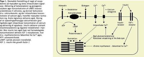 Den kliniske effekt skyldes formodentlig insulins direkte virkning på hjerte og kar og ikke en normalisering af den hyperglykæmi, som disse patienter ofte har. Til trods for at GIK har været brugt i over 30 år i forbindelse med hjertesvigt og iskæmi, er de molekylære mekanismer bag den insulininducerede inotropi ikke endeligt afdækket. Insulin øger primært hjertets optagelse af glukose og dermed glykogendepoterne. I skeletmuskler findes der en sammenhæng mellem nedsatte glykogendepoter og nedsat kontraktion og calciumfrigivelse med hæmning af de kontraktile proteiner [29]. Dette forhold kunne også gælde i hjertet. Øget glukoseoptagelse øger hjertets evne til opretholde den intracellulære calciumhomeostase under suboptimale forhold. Ydermere vil insulin i farmakologiske koncentrationer ikke alene kunne aktivere insulinreceptoren men også insulin-like growth factor1 (IGF-1)-receptoren. Det er derfor muligt, at noget af insulins inotrope virkning under højdosis GIK medieres ad denne vej. IGF-1 øger bl.a. myokardiets sensitivitet for Ca2+ [30]. Insulins og IGF1's inotrope virkninger er mere kompleks end adrenerg stimulation og formentlig mest indirekte (Figur 1). Dette er i overensstemmelse med de kliniske observationer, hvor effekten af GIK er 10-30 min om at indsætte og langsomt aftager efter ophør af infusionen.