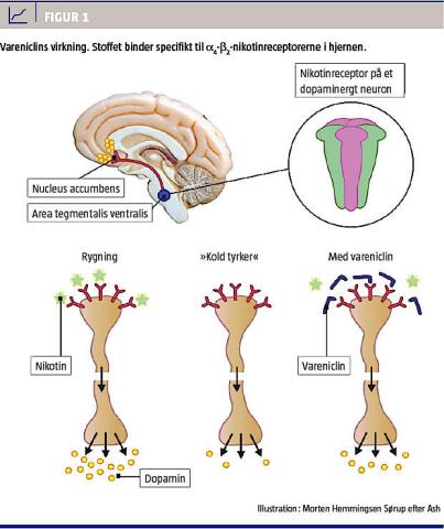 Vareniclin blev godkendt i EU i 2006 til rygeophør hos voksne [1]. Salget steg frem til 2011 til 1.033.000 definerede døgndoser (DDD) (26.157 personer), hvorefter det faldt i 2012 til 472.000 DDD (12.338 personer). Faldet kan skyldes den megen omtale af alvorlige bivirkninger eller et stigende forbrug af elcigaretter. Vareniclin binder specifikt til a4-b2-nikotinreceptorerne i hjernen (Figur 1), og det er fundet virksomt i placebokontrollerede undersøgelser [2]. Som partiel agonist blokerer det for nikotins virkning og nedsætter derved belønningsoplevelsen og rygningens selvforstærkende mekanisme, samtidig med at det lindrer symptomerne på rygetrang og abstinenser [1]. De hyppigste bivirkninger er kvalme, opkastninger og abnorme drømme.