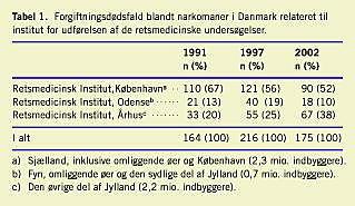 Ved de tre retsmedicinske institutter blev der i 2002 undersøgt 175 forgiftningsdødsfald blandt narkomaner. Dette udgjorde 71% af samtlige undersøgte dødsfald blandt narkomaner, hvilket var en mindre andel end i 1997 (81%) og i 1991 (75%). Antallet af forgiftningsdødsfald faldt med 19% fra 1997 til 2002. Der sås et fald på Sjælland og omliggende øer samt på Fyn og i Sønderjylland, mens der sås en stigning i resten af Jylland på 22% (Tabel 1 ).