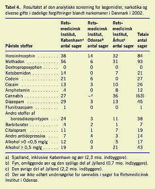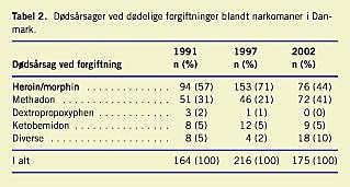 Resultater og diskussion: Antallet af dødelige forgiftninger blandt narkomaner udgjorde 175 i hele landet, hvilket var et fald på 19% i forhold til 1997. Faldet forekom i Østdanmark, på Fyn og i Sønderjylland, mens der i den øvrige del af Jylland sås en stigning. De dødelige forgiftninger udgjorde 71% af det samlede antal dødsfald blandt narkomaner mod 81% i 1997 og 75% i 1991. Forgiftninger med heroin/morphin udgjorde 44% af forgiftningsdødsfaldene, hvilket var et fald i forhold til 71% i 1997 og 57% i 1991. Faldet i antallet af dødsfald med heroin/morphin sås over hele landet. Antallet af forgiftningsdødsfald forårsaget af methadon var derimod steget i hele landet fra 31% i 1991, 21% i 1997 og til 41% i 2002, mest markant på Fyn og i Jylland. De hyppigst påviste lægemidler og/eller narkotika var i 2002 ligesom i 1997 methadon, heroin/morphin, cannabis og diazepam, hvor methadon i 2002 var hyppigere forekommende end heroin/morphin.