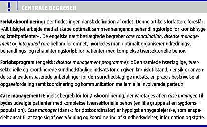 Begrebet forløbskoordinerin g (engelsk: care coordination ) dækker tilsigtet arbejde med at skabe optimalt sammenhængende behandlingsforløb for kronisk syge og kræftpatienter [8]. Forløbskoordinering er politisk højt prioriteret. Således iværksatte Sundhedsstyrelsen i 2008 de såkaldte »kræftpakker« [9] og beskrivelse af »forløbsprogrammer for kronisk sygdom« [10]. Der foregår desuden en livlig debat om, hvorvidt der bør oprettes særlige funktioner, der skal tage sig af koordinering af ydelser og optimal informationsudveksling i lange og tværgående patientforløb.
