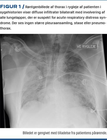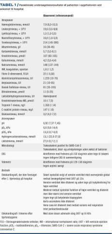 En 50-årig mand blev indbragt til et hospital genoplivet efter flere præhospitale hjertestop. Han havde ingen tidligere kendte sygdomme, var erhvervsaktiv, fysisk aktiv, aldrig-ryger og i øvrigt uden kendte risikofaktorer for iskæmisk hjertesygdom. Han havde været syg med feber og hoste i en uges tid op til hjertestoppene. Symptomerne var taget til i de sidste par dage med en samtidig følelse af åndenød. Der var ingen klager over brystsmerter. Han havde konsulteret læger over telefon flere gange i forløbet, og fik dagen inden hjertestoppene udskrevet antibiotika på mistanke om pneumoni. Om aftenen inden indlæggelsen havde han tiltagende åndenød med respirationsbesvær og manglende hostekraft. Pga. yderligere forværring i løbet af natten, ringede hans hustru 112, og i forbindelse med opkaldet mistede han bevidstheden. Der blev konstateret hjertestop, og hustruen påbegyndte hjerte-lunge-redning (HLR). Ambulancen ankom ca. 10 minutter senere. Den første registreret hjerterytme på skadestedet var asystoli. Efter HLR og indgift af adrenalin konverterede patienten til pulsløs elektrisk aktivitet (PEA) og blev intuberet. Han opnåede genoprettelse af spontan cirkulation (ROSC) ca. 12 minutter efter ambulancens ankomst. Efter ROSC havde han fortsat respiratorisk svigt med svær hypoksi. Han var i øvrigt svært cirkulatorisk labil og fik efterfølgende kortvarigt hjertestop to gange på vej til hospitalet. Ved ankomsten var han fortsat svært cirkulatorisk labil og fik hjertestop yderligere fem gange i akutmodtagelsen. Under hjertestoppene var hjerterytmen hver gang PEA med 2-6 minutter til hver episode af ROSC. Han havde på intet tidspunkt i forløbet stødbar hjerterytme. Efter noget tid blev han stabiliseret på store doser adrenalin og kørt på intensivafdelingen, hvor der blev givet maksimal organunderstøttende behandling inklusive infusion af store doser noradrenalin og specielt adrenalin. Han blev respiratorbehandlet i henhold til acuterespiratorydistresssyndrome (ARDS)-guidelines [4], og samtidig blev der påbegyndt dialysebehandling pga. svær metabolisk acidose. Han havde nedsat bevidsthedsniveau med Glasgow comascale 3 i hele forløbet. Der var ingen klinisk mistanke om en intrakraniel katastrofe. Han afventede overflytning til Rigshospitalet med henblik på veno-arteriel ekstrakorporealmembraneoxygenering (VA-ECMO), men gik desværre ad mortem syv en halv time efter ankomsten til hospitalet trods maksimal organunderstøttende behandling. Han blev senere konstateret positiv for SARS-CoV-2.De øvrige parakliniske undersøgelsesresultater er vist i Tabel 1 og Figur 1.