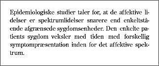 Det er foreslået at definere den bipolare lidelse som en spektrumlidelse, der omfatter det hypertyme og cyklotyme temperament, den hypertyme og cyklotyme personlighedsforstyrrelse, hypomani inklusive sekundær hypomani, bipolar lidelse type I og II og skizoaffektiv lidelse med maniske symptomer (26). Tilsvarende er det foreslået at definere den unipolare lidelse som en spektrumlidelse, der omfatter det depressive temperament, depressiv personlighedsforstyrrelse, dystymi, mild depressiv episode, moderat og svær depressiv episode og skizoaffektiv lidelse med depressive symptomer (27).