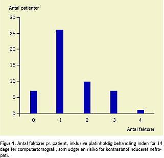 Resultater: Hos 31,4% var P-kreatinin målt maks. syv dage inden CT. I alt 43,1% havde fået platinholdigt cytostatika efter måling af deres P-kreatinin inden CT. 45,1% havde fået platinholdigt cytostatika inden for 14 dage før CT. 66,7% havde yderligere risikofaktorer. Ingen havde behov for nefrologisk intervention.